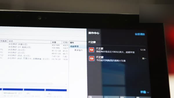 橫向安放的音量滑動條、WiFi網絡下的飛行模式開關等,都很適合觸控操作,雙手握持機器時,左右兩個拇指便可以很好的完成眾多操作。同樣是為了方便觸控考慮,右下角的通知欄位置圖標間隔也進行了加寬處理,更容易點擊。