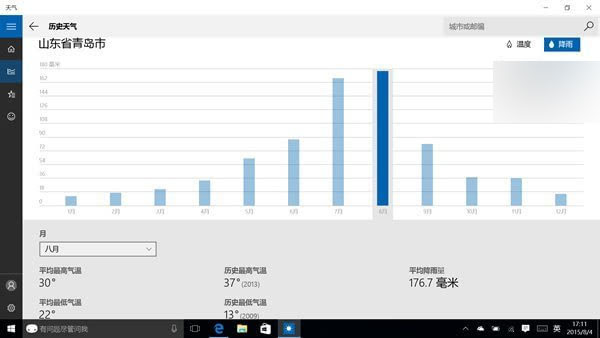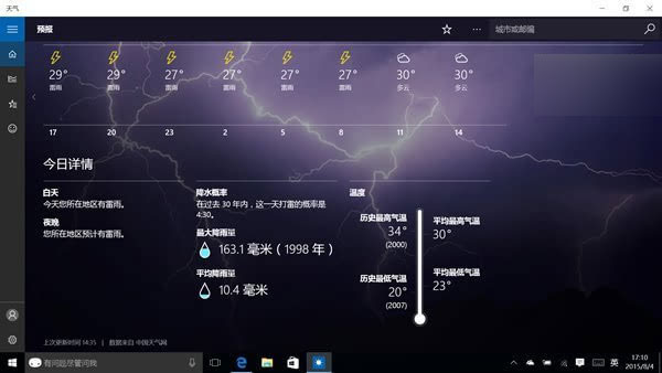 ▲Win10系統自帶的天氣應用所給出的信息也是異常豐富,不僅有七天的預報,還有分時預報以及歷史溫度、降雨量統計等。