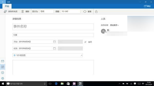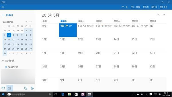 ▲郵件和日歷應用中,Win10甚至還標出了未來五天的天氣情況,十分貼心,不過卻缺少了國人所需的農歷顯示功能。點擊具體日期即可添加事件提醒,不過有了小娜Cortana,這事還是靠語音來解決吧。