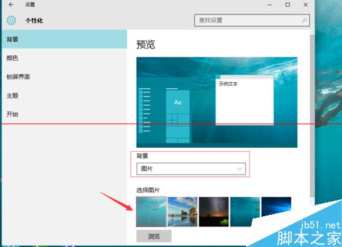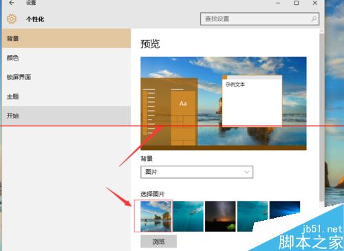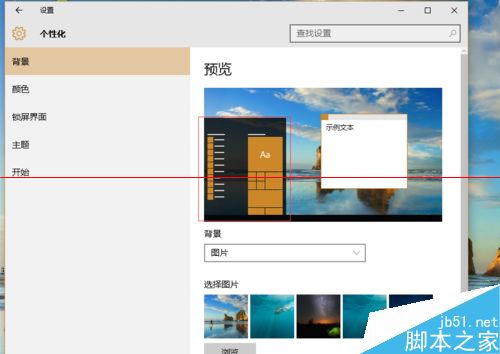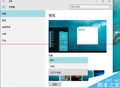 6、如果我們不是想要用單一的圖片作為背景怎么辦呢?有辦法,首先按照第五步將背景圖片換成我們想要的那個,開始菜單和任務欄等都變成了我們習慣的顏色,接下來我們將更換圖片上面的一個【背景】選項的下拉菜單更改為【幻燈片放映】,下面就會自動由圖片換成系統默認的一個桌面背景的“圖片”文件夾。我們無需更改這個,當然你也可以把你喜歡的圖片放到這個圖片文件夾里,系統就會每隔一段時間自動更換桌面背景。