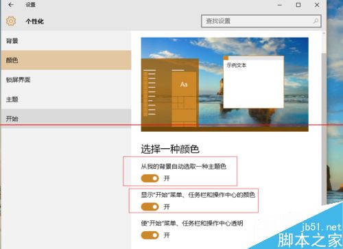 4、我們點擊左邊的【顏色】選項卡。右側有一項【從我的背景自動選取一種主顏色】在這個選項下面還有一個選項【顯示“開始”菜單、任務欄和操作中心的顏色】如果這個開啟那么開始菜單、任務欄和操作中心也會帶有背景主顏色的效果。