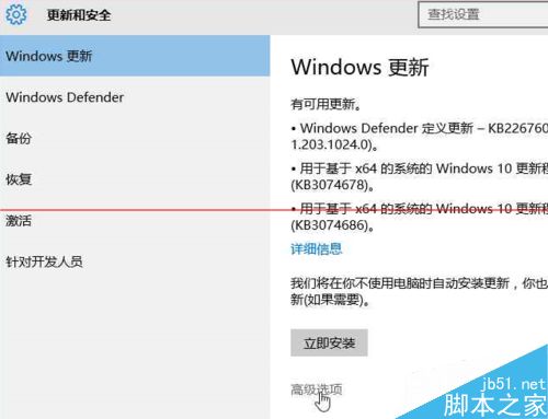 4、在接下來(lái)的更新和安全界面里,點(diǎn)擊右側(cè)下方的“高級(jí)選項(xiàng)”鏈接。(當(dāng)然這種方法也可以Windows Insider預(yù)覽版本怎么暫停更新?)