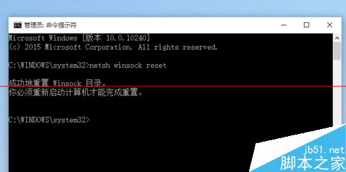 2、在彈出的對話框中輸入“ netsh winsock reset ”命令,之后按回車鍵確認。
