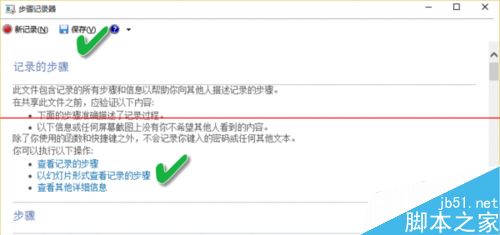 6、操作步驟記錄之后,可通過兩種方法查看記錄的步驟。一是以圖文版式查看,在記錄窗口直接滾動鼠標查看即可;另一種方法是以幻燈片形式演示記錄過程,點擊“以幻燈片形式查看記錄的步驟”文字鏈接來進入幻燈演示