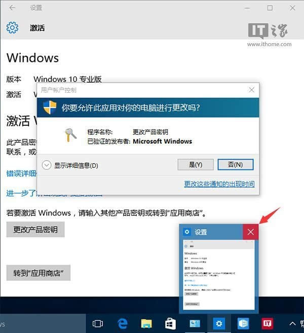 是在測試Build 10240更換Win10激活密鑰,以及在應用商店購買Win10專業版密鑰的過程中發現這一問題的。這兩個任務所涉及的均為Windows應用(“設置”和“應用商店”),而且中間都需要用戶對操作進行管理員授權。而在點擊例如“更改產品密鑰”后卻發現窗口假死,但就在想通過任務欄窗口預覽關閉應用時,卻發現 將鼠標移動到預覽窗口的關閉按鈕“X”后,出現了UAC窗口預覽。不過此時如果把鼠標移動到“X”以外的位置,預覽效果就會消失,因此 這種遮擋效果無法解除,通過Alt+Tab等切換方式也無法調出UAC授權對話框。