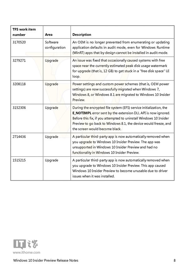 本次修復內容涉及各個方面,其中“升級”問題修復依然是重頭戲,比如Win7/Win8.1自定義(或OEM版)電源計劃在升級后可以得到保留;另外回滾Windows 8.1時發生“黑屏凍結”導致失敗的問題也得到了解決;升級到Win10預覽版后有問題的特殊第三方應用也將被自動移除。