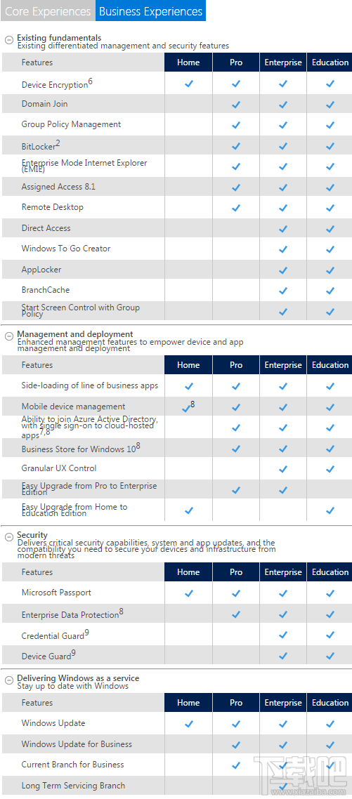 商業(yè)特性差異就體現(xiàn)出不同了。家庭版功能最少,僅支持設(shè)備加密(InstantGo)、企業(yè)應(yīng)用side-loading(PC與移動(dòng)設(shè)備互連)、移動(dòng)設(shè)備管理、微軟賬戶、普通版Windows Update,另外它能升級(jí)為教育版。