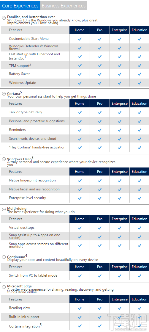 從上圖可以看出,核心功能上,四個(gè)版本是完全一致的,因此不管你選擇什么版本,都能得到最核心的Windows 10體驗(yàn),包括原有功能升級(jí)、Cortana小娜語(yǔ)音助手、Windows Hello安全登錄、虛擬桌面多任務(wù)、平板模式切換、Edge瀏覽器等。