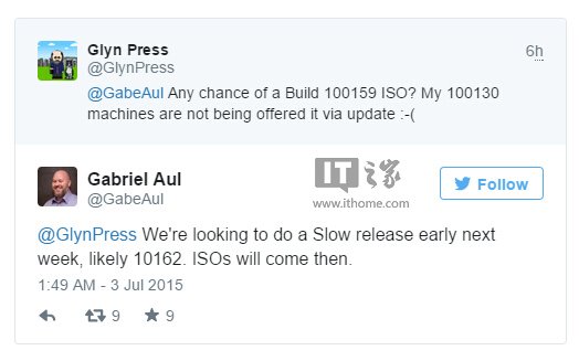 關于下一個慢速版的推送時間,Insider項目負責人在推特上表示:“我們當前正在準備,下個Win10預覽版慢速更新有望在下周早些時候到來,版本很可能就是今天推送的10162版本,屆時也將發(fā)布ISO鏡像下載。”