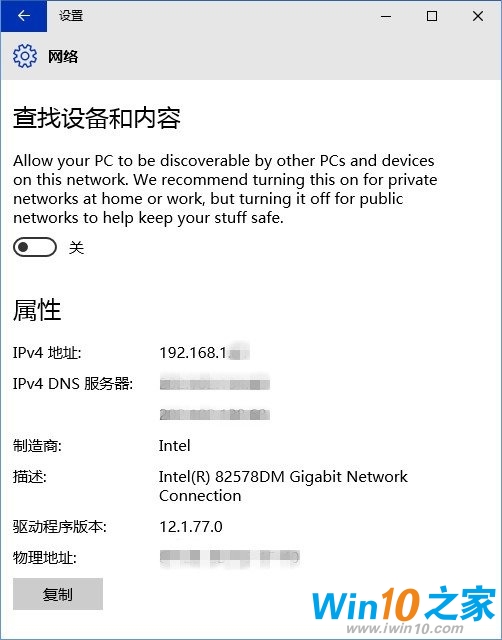 3. 點擊你當前已連接的那個網絡,便可以看到“查找設備和內容”開關,如果關閉則適用于“公共網絡”;如果打開則適用于“家庭網絡”和“工作網絡”,這里就可以根據自己的需要來進行設置了。
