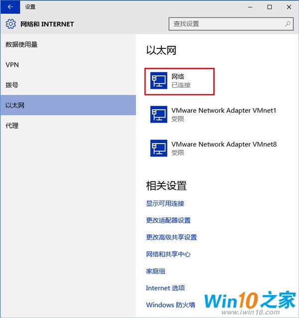2. 選擇第三項“網絡和Internet”,點擊進入后選擇“以太網”,然后便可以看到網絡連接了,這里需要注意的是如果你連接的是無線網,那么這里選擇“WiFi”選項;