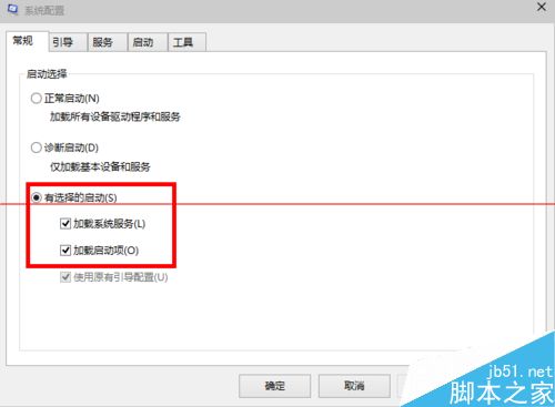 3、這時候會打開一個名為“系統配置”的窗口,在“常規”選項框下 我們勾選“有選擇的啟動”下的“加載系統服務”和“加載啟動項”