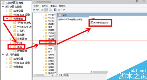 2、我們依次點擊“管理模板——系統——關機”,然后我們雙擊“要求使用快速啟動”