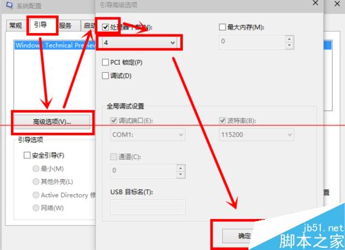4、后我們依次點擊“引導——高級選項“我們在”引導高級選項“窗口勾選”處理器個數“ ”處理器個數“下的數字選一個最大的數 小編這里是”4“,點擊”確定“