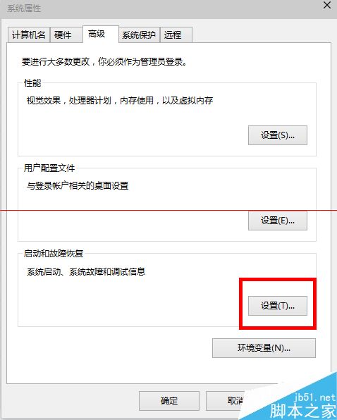 3、這時候會彈出一個“系統屬性”窗口,我們點擊“啟動和恢復故障”下“設置”