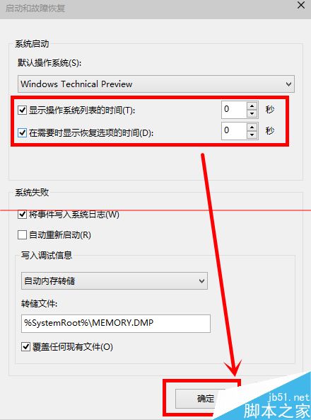 4、在“啟動和恢復故障”窗口里,我們把以下兩欄的時間改短一些,小編這里改為“0”,你們可以改為“3”,然后“確定“