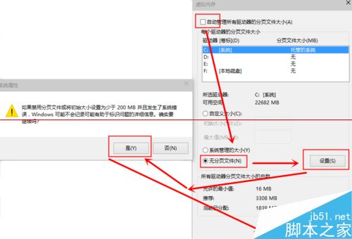 6、點擊“更改”后,來到”虛擬內存“窗口,我們取消勾選“自動管理所有驅動器的分頁文件大小”,勾選“無分頁文件”,勾選過后,我們點擊“設置”,點擊“設置”后會出現一個“系統屬性”窗口,我們點擊“是”,點擊“是”后,我們點擊”虛擬內存“窗口下的“確定”