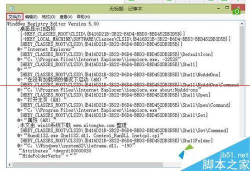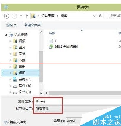 3.點擊文件 – 另存為,在另存為窗口中修改文件名為“IE.reg”然后保存類型為“所有文件”點擊“保存(S)”進入下一步操作。如下圖所示