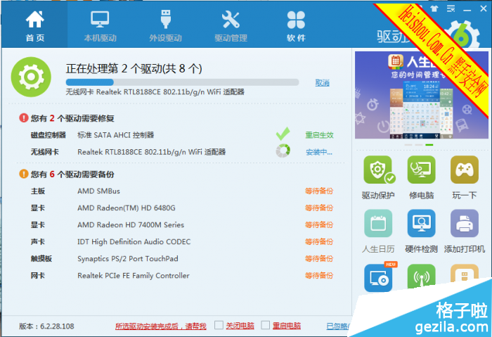 當小編點擊開始檢測按鈕時,便告知小編有8個驅動需做處理、修復,當你點擊開始圖標,驅動人生便馬不停蹄的開始幫你修復驅動了。