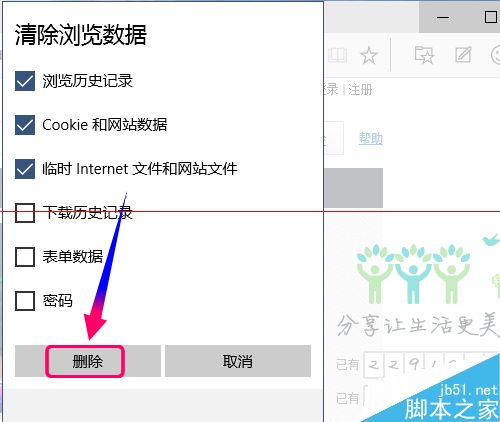 6、點(diǎn)擊[清除瀏覽數(shù)據(jù)],彈出對話框選擇你需要清除的內(nèi)容項(xiàng)目,點(diǎn)擊[刪除]