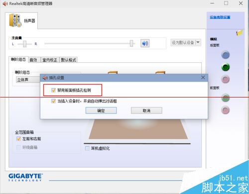 7、單擊設置文件夾后,把“禁用前面板插孔檢測”勾上并確定