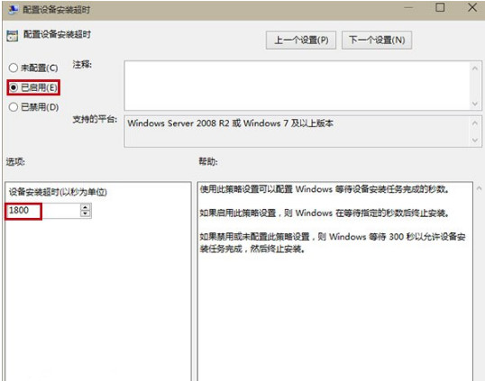 3、在窗口左上方選擇“已啟用”,然后在左邊中間位置“設備安裝超時”中設定“1800”秒后單擊確定