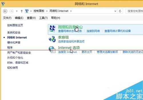 3、網絡和internet界面下面,鼠標選擇網絡和共享中心,左鍵單擊進入