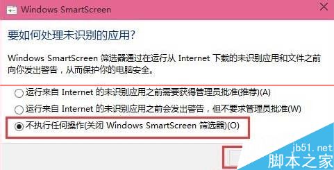 5、將smartscreen篩選器設置為“不執(zhí)行任何操作(關閉 Windows smartscreen篩選器)”并確定保存設置;