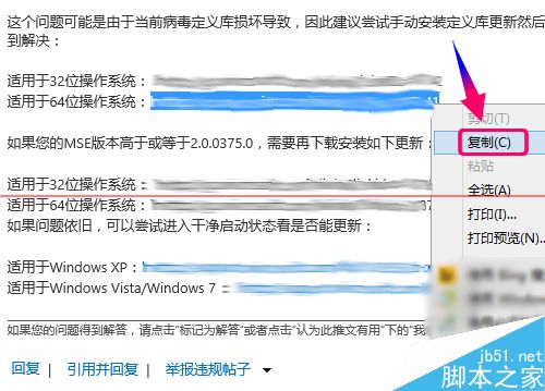 3、然后你會(huì)在第一個(gè)搜索結(jié)果里找到解決方案,打開進(jìn)入該文章,造成此原因是系統(tǒng)自帶病毒庫異常造成,因此我們只需要按照上面的提示,復(fù)制對應(yīng)系統(tǒng)位數(shù)的連接,下載病毒庫到本地更新