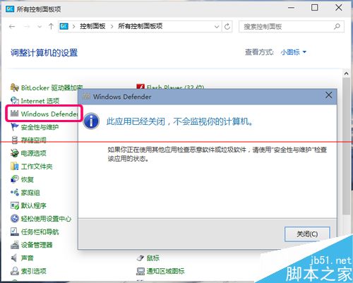 6、病毒庫下載完成后,直接打開執(zhí)行病毒庫更新操作,更新完成后,打開控制面板,點(diǎn)擊進(jìn)入Windows Defender選擇關(guān)閉