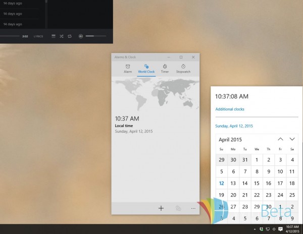 除了開始菜單外,Windows 10 build 10056還對系統(tǒng)時鐘也進行了一些調(diào)整?,F(xiàn)在,當(dāng)用戶點擊時間/日期時,頁面就會跳出一個跟移動客戶端一樣的時間和日期顯示界面。跟移動端一樣,用戶也能在上邊輕松添加鬧鐘、使用秒表、計時器。