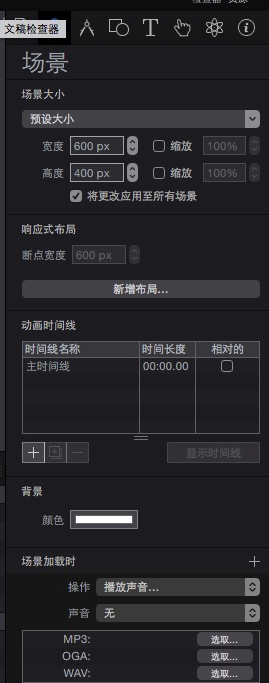 Hype 3 右側的檢查器中包含了各種對文稿以及內(nèi)容設置的功能,比如我們可以選擇顯示器兼容性,HTML 網(wǎng)頁標題等文檔相關的設定。場景界面下,可以選擇場景加載時、卸載時、按鍵時以等操作時,場景內(nèi)元素產(chǎn)生的各種行為。