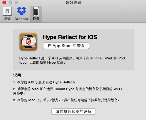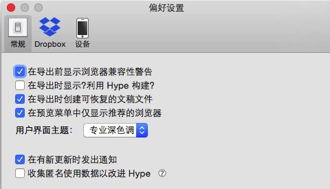 Hype 3 的常規(guī)設置中,可以調(diào)整用戶界面主題色調(diào),以及一些警告的提示設置。此外,Hype 3還可以通過 Dropbox 同步數(shù)據(jù),目前應用還不支持 iCloud Drive。最后,應用還有 Hype Reflect for iOS 的推薦,iOS 版 Hype 可以即時預覽 Hype 生成的網(wǎng)頁和 HTML 5動畫。總得來說,Hype 3 將復雜的網(wǎng)頁和動畫創(chuàng)建功能集成在簡單易于使用的界面之中,當然學些 Hype 3 也需要一些精力和時間,不過整體過程要比學習變成更容易一些。
