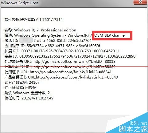 2、上述命令是顯示:最為詳盡的激活信息,包括:操作系統版本、部分產品密鑰、許可證狀態、激活ID、安裝ID等等。如圖,在描述中可查看系統版本。