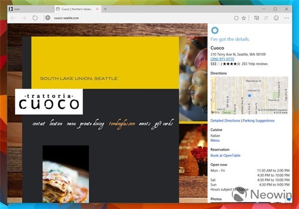Project Spartan內(nèi)置了Cortana,不過(guò)相對(duì)比較“安靜”,只有在有相關(guān)信息時(shí)提示你,比如說(shuō)訪問(wèn)餐廳的網(wǎng)站,Cortana會(huì)提示找到更多信息。也可以右鍵中Ask Cortana主動(dòng)激活Cortana來(lái)查詢。