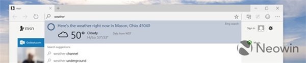 Cortana也可以這么用:在地址欄輸入Weather可以查詢當(dāng)前的天氣,等等使用場(chǎng)景。