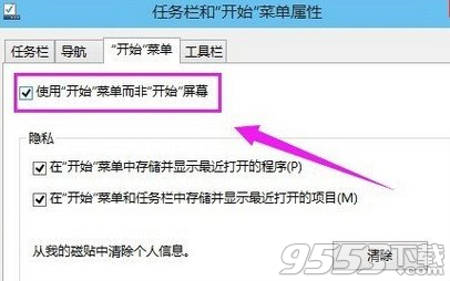 2、點(diǎn)擊開始菜單,再把"使用開始菜單而非開始屏幕"勾上再點(diǎn)擊確定。