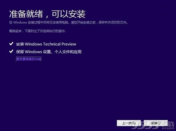 注意,無論選擇哪個選項,升級后當前系統都會被Win10技術預覽版替代。其中的“個人文件”是指“用戶”文件夾下的內容;具體哪些應用可以保留取決于這些應用在Win10預覽版中的兼容性;如果選擇“不保留任何內容”,升級后“個人文件”仍會被保存下來,移至名為Windows.old的文件夾中。