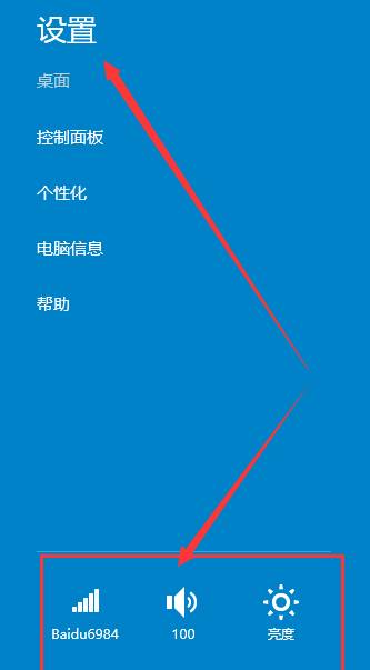 使用鼠標(biāo)點(diǎn)擊窗口右側(cè)的設(shè)置,用戶可以窗口上面設(shè)定桌面和個(gè)性化,可以在窗口下面設(shè)定網(wǎng)絡(luò),音量和亮度。