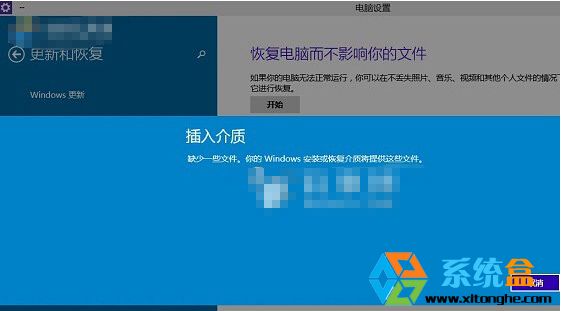 5、這時會彈出讓我們插入介質的提示,原因就是恢復 win10系統需要Win10安裝光盤或安裝U盤,想必安裝過的朋友都會有保存原來的安裝光盤或U盤,沒有的話可以使用win10原版ISO制作一個安裝U盤。使用UltraISO類軟件,將win10 ISO打開,然后寫入到U盤。