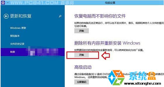 4、在恢復選項中有幾個恢復方式,【恢復電腦而不影響你的文件】該項可以恢復系統原文件而不會丟失你安裝系統之后創建的文件,【刪除所有內容并重新安裝】則跟重裝系統差不多,如果系統盤中沒有什么重要的文件的話,小編推薦使用【刪除所有內容并重新安裝】選項,讓系統恢復的更為徹底,點擊下圖中的“開始”按鈕進入下一步;