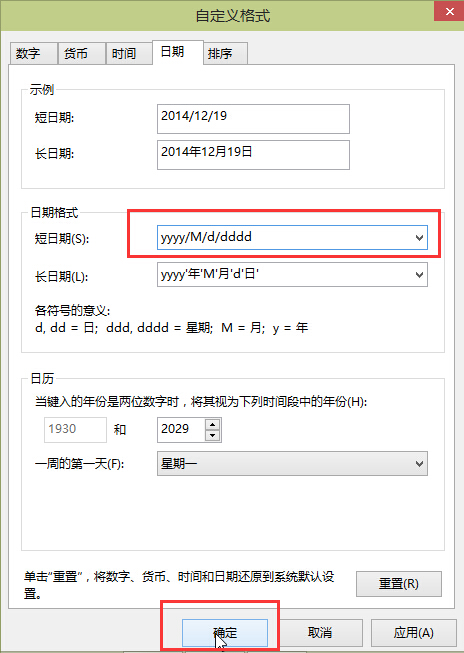 5.在打開的自定義格式窗口中,點擊修改短日期后面方框中的英文為“yyy/M/d/dddd“點擊確定完成操作。如下圖所示