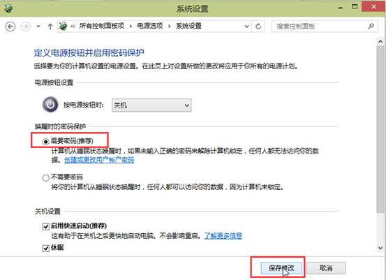 6.點擊選擇“需要密碼”然后點擊“保存修改”完成設置。如下圖所示