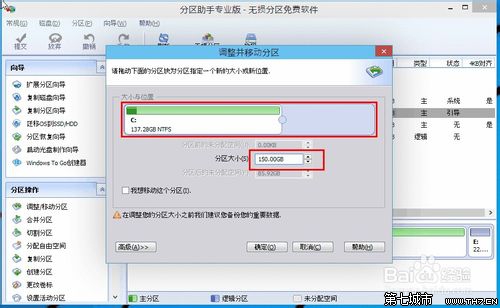 2、來到此對話框,此時我們可以調整分區大小。然后當鼠標指針變成雙向箭頭時,拖動直到你滿意的容量位置。這里C盤已經被操作為150GB。之后點擊“確定”。