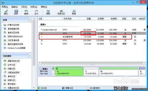 3、返回到了主界面,至此win10分區c盤太大這時C盤已經變為150GB,在此也出現了一個“未分配空間”。