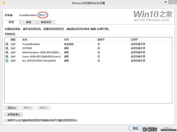 ▲點擊“確定”關閉“Network高級安全設置”窗口后,在“安全”選項卡中選擇“Administrators”(管理員)標簽,確認“完全控制”被鉤選,然后點擊“確定”應用修改。
