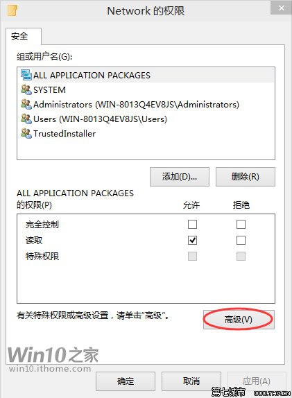 ▲在彈出的“權限”窗口中,點擊下面的“高級”按鈕