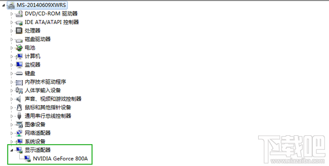 3.點擊左邊的“設備管理器”,展開“顯示適配器”即可查看顯卡配置(型號NVIDIA GeForce 800A),GPU頻率、顯存等信息此處是看不了的。