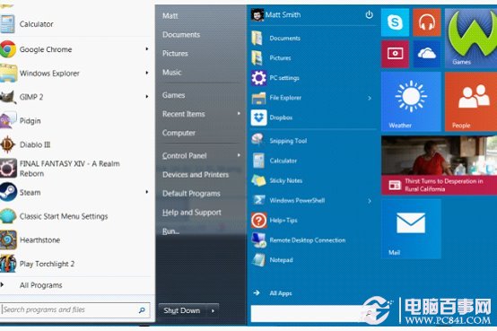 而即便忽略掉動態(tài)磁貼,開始菜單看上去依然不對勁。在默認(rèn)下,它的色彩會根據(jù)系統(tǒng)主題而變化,但這同時也是Windows10當(dāng)中唯一會適配系統(tǒng)主題的菜單。把它和Windows7直接對比你就會發(fā)現(xiàn),后者僅更易閱讀,同時也顯得更加緊湊。
