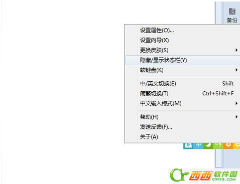 2、在輸入法狀態欄上右鍵單擊選擇隱藏/顯示狀態欄